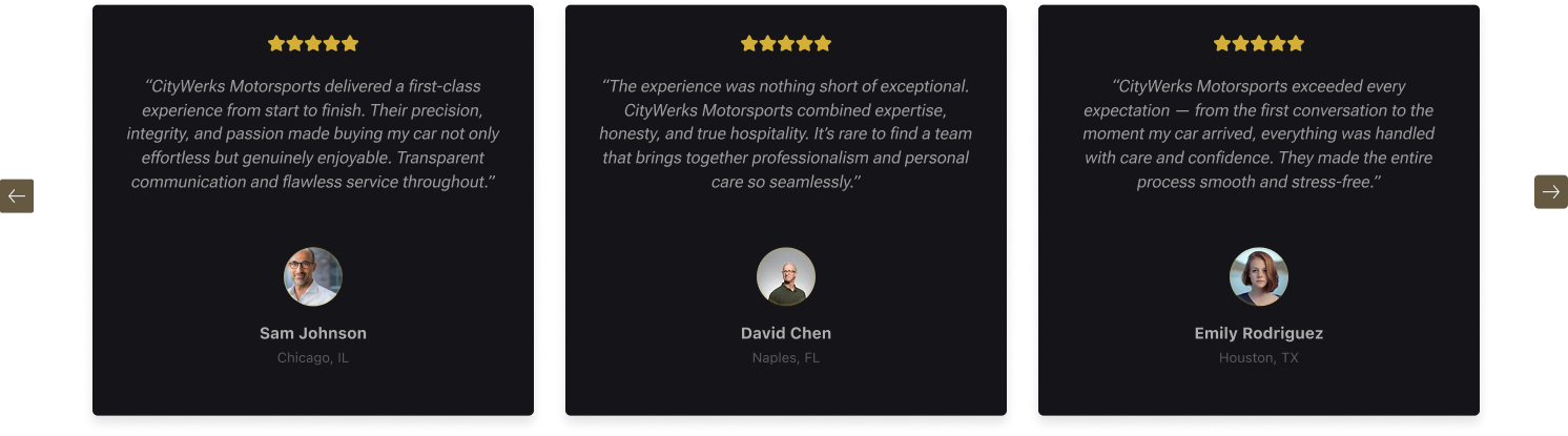 At CityWerks Motorsports, we believe refined performance should be attainable without compromise. Our finance specialists work with trusted partners to tailor solutions that fit your goals — whether you’re exploring a first-time purchase or adding to a growing collection.